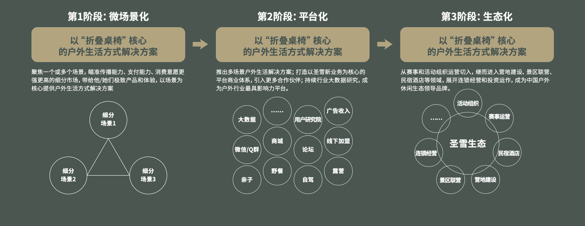第三阶段:以“跨界”场景为核心的折叠桌椅,打造健康的奢享户外生活方式。与多品牌的 跨界合作,具有同等熟悉的产品和门店结合,打造具有话题性和传播属性的跨界营销,比 如:在星巴克/4S门店摆放产品,形成具有特色的跨界场景;或与IP联名在具体的产品或活动中;形成具有一定的品牌影响力,不断占领市场,占领消费者认知,想要支撑这样的品牌战略规划,我们需要系统的思考,结合圣雪集团的自身优劣势,最终形成整体的解决方案!