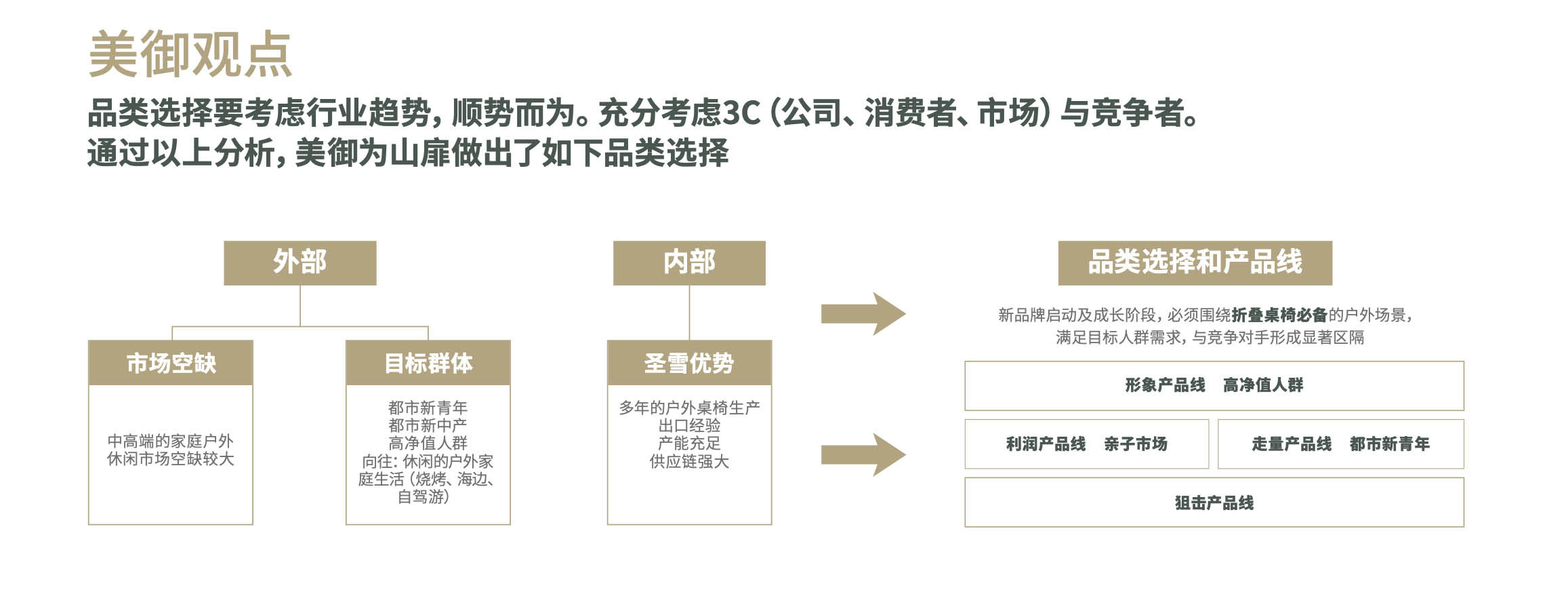美御根据产品721法则协助山扉规划产品系统,打造更便捷的户外露营桌椅单品。折叠椅 根据产品的配置不同,价格由50到500之间有所不同,售价相对更加大众化,满足不同目 标消费者的需求,折叠桌同理,价格在100到800之间。二者承载了产品销售量的70%。 同时,开发帐篷、天幕、地垫、营地车等利润型产品,承载20%的销量。最后,厨具、炉 具、旅行用品、箱包等户外配套产品,区隔于其他竞争对手,塑造健康的户外生活方式,承载10%的销量。