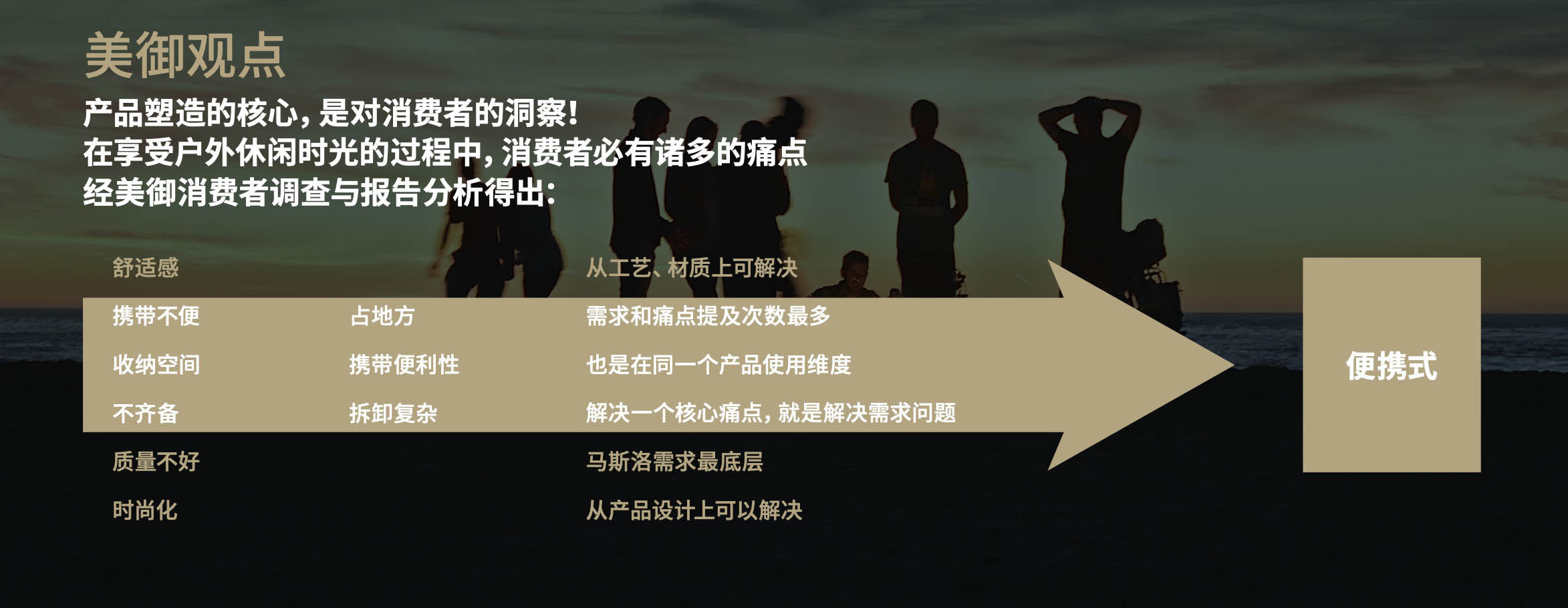 不可忽略的是,高端市场仍然是空白。美御最终分析确定,可以利用企业优势和消费者需求,将圣雪新品牌Sunnyfeel山扉, 以折叠桌椅作为爆品(人无我有,人有我优),立志将Sunnyfeel山扉打造成家庭奢享户外创领品牌,建立差异化的品牌认知,快速抢占市场!