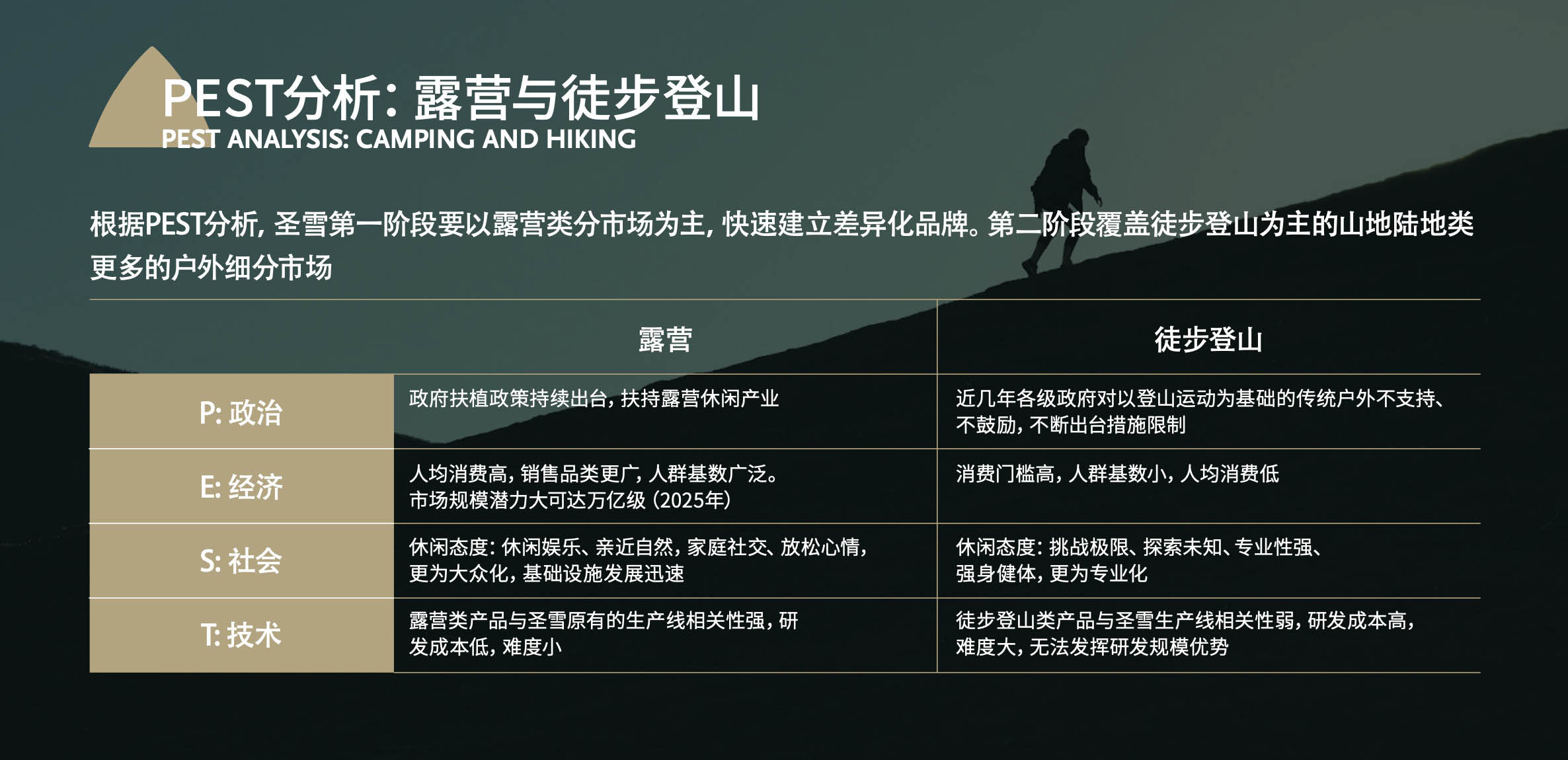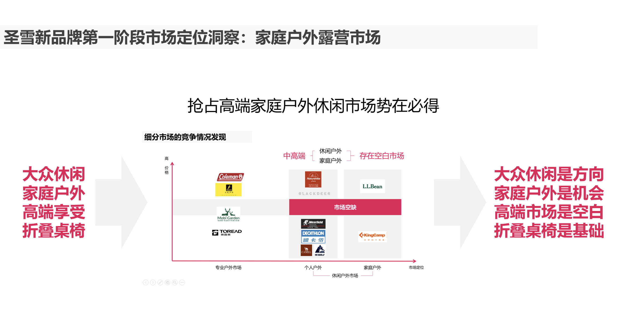 针对国内的户外市场,利用圣雪积累多年的优势资源,结合企业使命和愿景,建设一个有 市场竞争力的新品牌,快速抢占市场,成为健康户外生活方式引领者。 对于这个新品牌,计划在3年内做到3-5个亿销售规模。