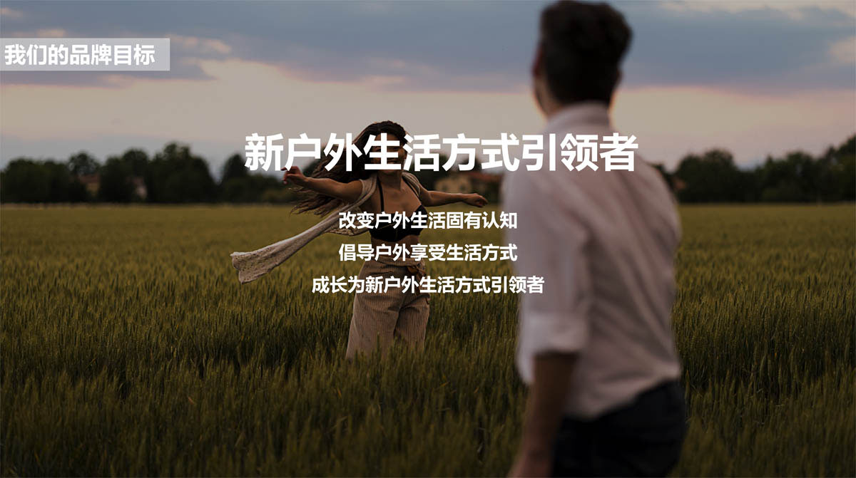 第二:以年轻化的方式重新定义休闲户外装备,通过产品创新、模式创新、运营提升,打造一个全新的中高端休闲户外品牌,满足目标消费群体的期待。